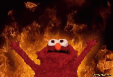 Elmo, the red puppet, stands with arms raised against a dramatic backdrop of intense flames.