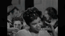 Elza Soares smiles and sings with confetti in her hair, surrounded by a lively crowd at a party.