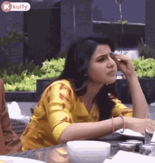 Samantha Akkineni reacting with a 'What Happened' expression while sitting at a table in an outdoor setting.