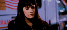 Emily Prentiss from Criminal Minds stands in front of an ambulance as snow falls.