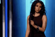 Emmaminaj, also known as Emma Roberts, stands confidently on stage holding a microphone.