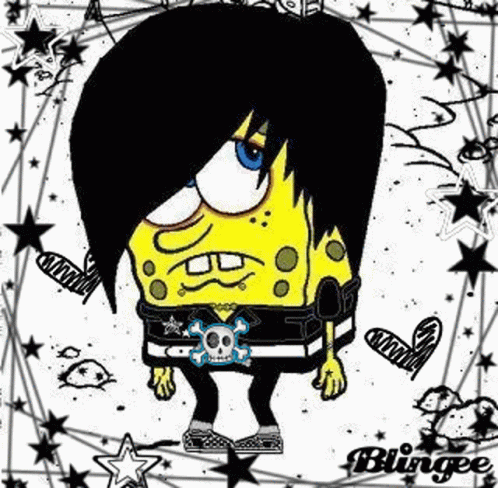 Spongebob Squarepants dressed in a black and white emo outfit with a skull and crossbones design.