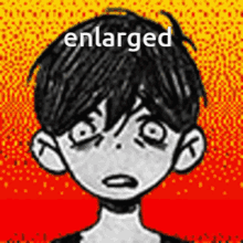 Omori Sunny in an enlarged and enraged pixel art state, with wide, scared eyes against a vibrant background.