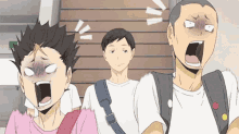Nishinoya and Tanaka from Haikyuu react with wide-eyed shock, while Ennoshita looks on calmly.