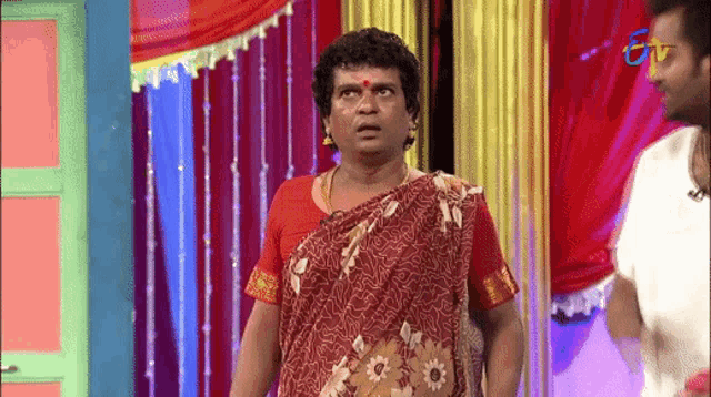 A comedian in a red saree makes a funny face during a Jabardasth Telugu comedy skit, featuring Sudigali Sudheer and Rashmi Gautam.