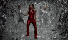 Anitta dances energetically in a sparkling red jumpsuit against a shimmering foil background.