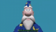 A cartoon wizard, Mago Trompete, with a blue hat and white beard, enthusiastically plays a golden trumpet.