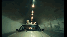 Hunter Schafer as Jules Vaughn stands through a car sunroof, smiling in a lit tunnel.