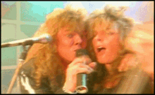 Joey Tempest of Europe and another band member passionately singing into a microphone during a live performance.