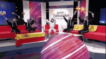 Soleá and her dancers celebrate with Spanish flags at the Junior Eurovision Song Contest.