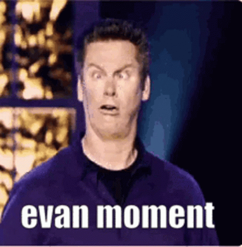Evan Bowling makes funny, exaggerated facial expressions in a purple shirt, embodying an 'Evan Moment'.