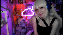 Evangelina_cos winks and smiles playfully while wearing a blonde wig and headphones in a neon-lit room.