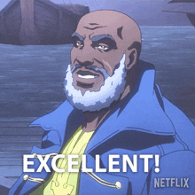 Lance Reddick's character, the Captain from Castlevania, smiles and exclaims "Excellent!" with a ship in the background.
