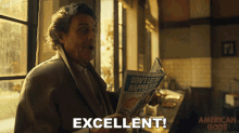 Mr. Wednesday, portrayed by Ian McShane, reacts with an 'Excellent!' while reading a newspaper.
