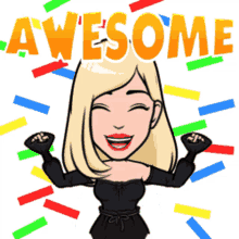 A cheerful cartoon woman celebrates with colorful confetti, exclaiming 'AWESOME' above her head.