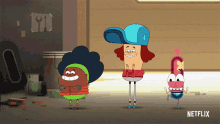 Jj Jameson, Babs Byuteman, and Pinky Malinky characters are excited and dancing, with the Netflix logo visible.