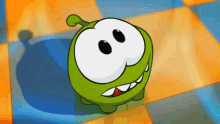 Om Nom, the green cartoon character from Cut The Rope, looks excited and pumped, then gazes at a hanging candy.