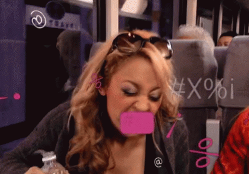 A woman's mouth is censored with a pink bar and expletive symbols while she appears to be cursing.