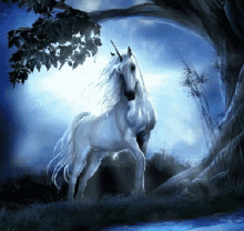A majestic white unicorn with a golden horn and mane stands gracefully under a tree in a vibrant green field.