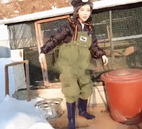 Farmgrr in green overalls and blue boots playfully kicks in a snowy outdoor setting.