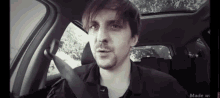 Josh, a vlogger, talks to the camera while sitting in a car, wearing a seatbelt, with a black and white filter.