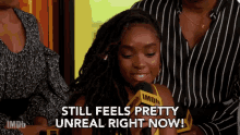 Kiki Layne expresses that it "still feels pretty unreal right now" during an interview, holding an IMDb microphone.