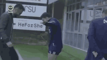 Fenerbahçe player Ozi shares a playful moment with a man on the soccer field, showing off some moves.