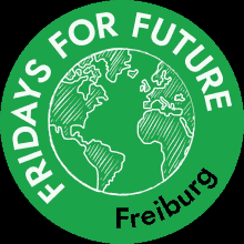 A vibrant green circular logo for Fridays For Future Freiburg, featuring a white outline of the Earth.