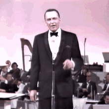 Frank Sinatra, in a tuxedo, performs on stage with an iconic finger wag gesture.