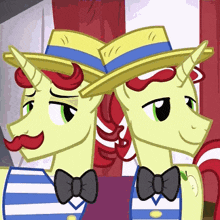 Flim and Flam, the cartoon ponies from My Little Pony, stand back-to-back in their signature hats and bow ties.