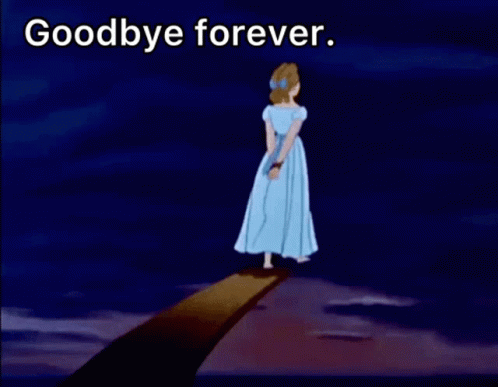 A cartoon girl in a blue dress stands on a bridge, with the text 'Goodbye forever.'