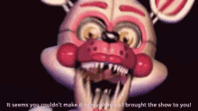 Funtime Foxy from Five Nights at Freddy's delivers a chilling line: 'It seems you couldn't make it to my show, so I brought the show to you!'
