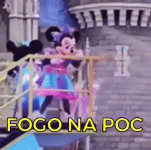 Minnie Mouse on a parade float with "Fogo Na Poc" text, followed by a fiery explosion effect.