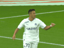 Alexis Sanchez celebrates a goal for Olympique de Marseille, wearing a white jersey with 'CAZO' on it.