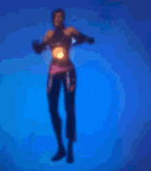 Psylocke performing an emote dance in Fortnite, set against a vibrant blue background.