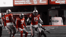 Francis Bernard of Utah Football celebrates on the field during a night game, with Chick-fil-A and Ford ads visible.