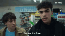 Two young men in a store, one stating 'For us, it's free' in front of a 'La Presse' sign.
