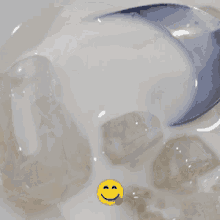A close-up of a refreshing fresh milk dessert with ice cubes and a spoon, featuring a smiley emoji.