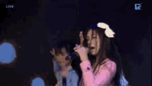 Freyajkt48 of JKT48 performs on stage, singing and dancing with group members in colorful jackets.