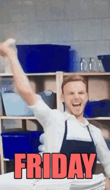 An animated man in an apron performs a joyful Friday dance with a napkin, celebrating the weekend.