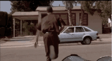 A man runs down a suburban street, seemingly escaping after a robbery, with a white car parked nearby.
