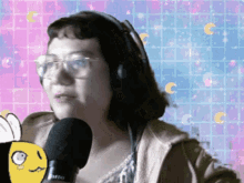Yamillar wearing headphones, holding a microphone with a bee, and dancing.