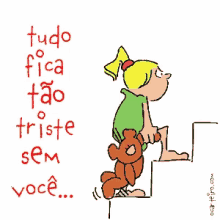 Fufi, a cartoon girl, sadly climbs stairs with her teddy bear, with the text 'everything gets so sad without you'.