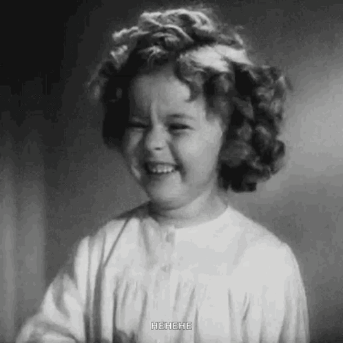 A little girl with curly hair laughs heartily, covering her mouth in a charming black and white clip.