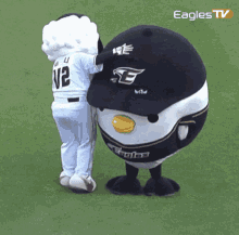 Hanwha Eagles mascot Woni playfully pushes Funny Bird, causing it to fall on the baseball field.