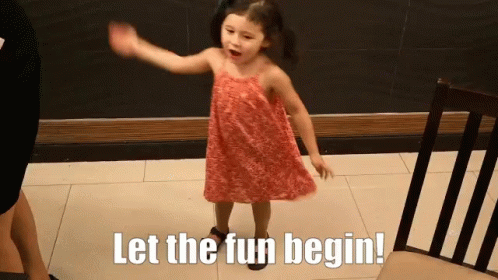 A cheerful little girl in a coral dress joyfully dances, with the on-screen text 'Let the fun begin!'