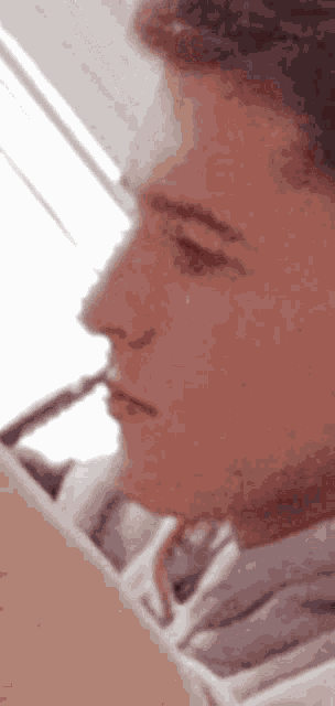 A man's face in a close-up shot, looking at the camera with a pen held in his mouth.