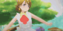 Love Live! School Idol Festival characters dance and make a heart gesture in a colorful game world.
