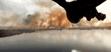 A majestic Game of Thrones dragon soars over water with a fiery, smoke-filled landscape in the background.