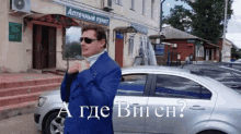 A man in a blue suit and sunglasses stands on a street, gesturing and asking, 'Where is Vigen?'